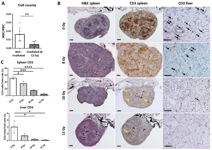 Figure 3. Allografting in irradiated wild-type X. tropicalis animals. (A) Plots showing hemocytometer cell counts as represented by white blood cell (WBC)/red blood cell (RBC) ratios of irradiated animals and non-irradiated controls. (B) H and E and anti-CD3 immunostained sections from spleens and livers of all 4 groups. Yellow arrows show CD3 positive zones in the spleen; black arrows show CD3 positive cells in the liver. (C) IHC quantified CD3 data of spleens and livers using the open source digital analysis tool QuPath [20]. * p < 0.05, ** p < 0.01, *** p < 0.001, **** p < 0.0001. All scale bars are 50 µm. Bar charts shown represent means with SD as error bar.