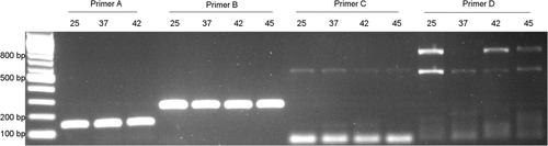 Figure 6. Fragments of different sizes amplified to determine integrity of ZEG-extracted gDNA. DNA was ZEG extracted at NF 25, NF 37, NF 42, and NF 45, amplified with primer pair A (150 bp), B (260 bp), C (550 bp) & D (800 bp) and resolved on a 1% agarose gel. Contrast was adjusted to reveal the low intensity spurious bands |