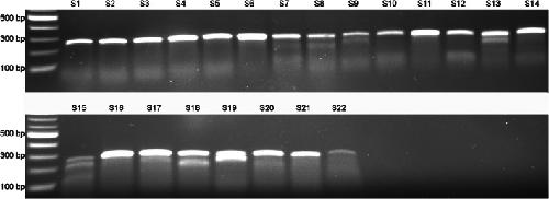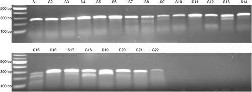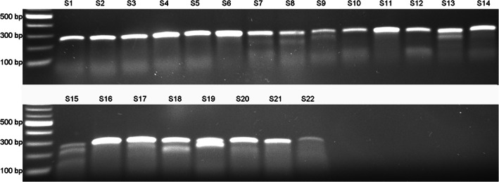 FIGURE 9. Results of the T7 endonuclease I assay performed to identify mutant animals. Xenopus tropicalis embryos (n = 22) were subjected to CRISPR/Cas9 gene editing. DNA was extracted using ZEG at NF 37 and a 260 bp target region was amplified. The amplicons were tested for induced mutations by T7 endonuclease I assay. Samples 8, 9, 13, 15, 18, and 19 showed cut bands denoting potential mismatches as a result of INDELs |