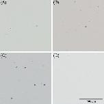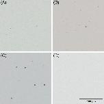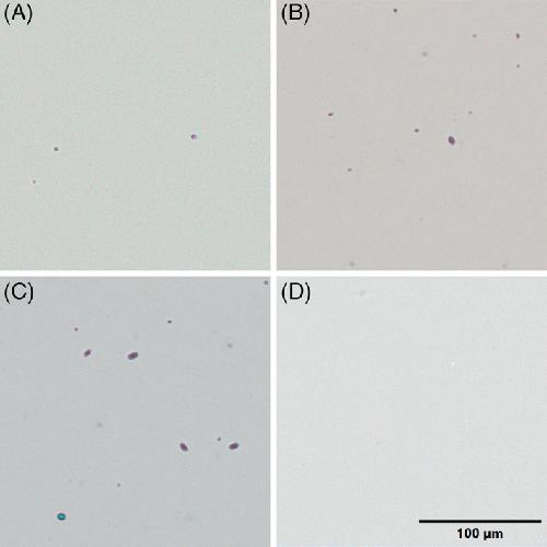 Figure 2. Cellular material extracted using the ZEG. Following ZEG extraction of Xenopus tropicalis embryos, selected samples across a range of DNA concentrations were mixed with Trypan Blue (1:1) and imaged; (A) NF 25 - known DNA concentration 32 ng/μL, (B) NF 25 -33 ng/μL, (C) NF 19 - 63 ng/μL, and (D) 0.05X MMR (blank). Few Trypan Blue stained (dead) cells and fragments as well as occasional Trypan-excluding, presumably live cells, are visible in preparations. Scale bar = 100 μm. |