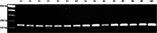 Figure 4. One hundred and fifty base pairs fragments successfully amplified from Xenopus tropicalis DNA extracted using ZEG. DNA was extracted from 3-4 individual embryos at NF 25 (lane 2-4), NF 37 (lane 5-7), NF 42 (lane 8-11), and NF 45 (lane 12-15). A 150 bp target region was amplified and resolved on a 1% agarose gel. DNA from a sacrificed embryo (NF 25) was extracted by the conventional method and used as a positive control (Ctrl) |
