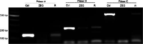 Figure 8. DNA amplification can be facilitated by Restorase. DNA was ZEG extracted at NF 37 and amplified with primer pair A (150 bp; lane 3-4), B (260 bp; lane 6-7) and C (550 bp; lane 9-10). DNA was amplified with either GoTaq G2 Polymerase (ZEG) or Restorase DNA Polymerase (R). The samples were resolved on a 1% agarose gel alongside positive control DNA PCR products amplified with GoTaq G2 Polymerase (Ctrl) |