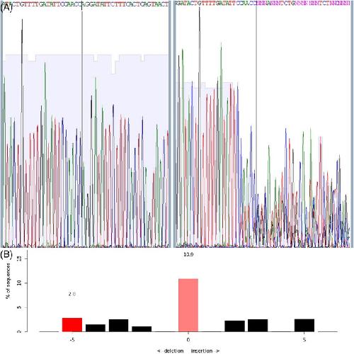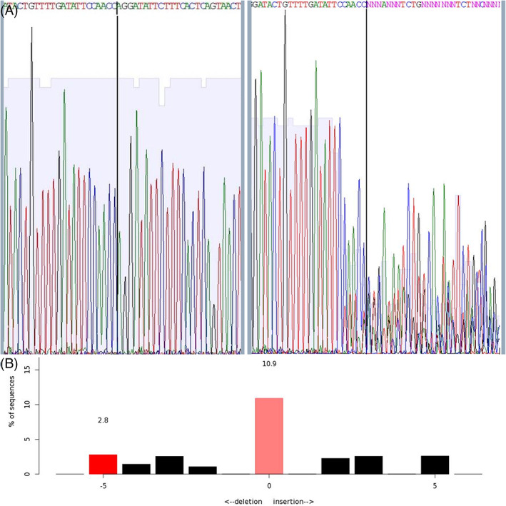 FIGURE 10. Characterization of INDEL formation using Sanger sequencing and TIDE analysis. Sanger sequencing trace of control (left) and sample 19 (right) ZEG‐extracted DNA. The degradation of the sequence at the expected cut site (black line) results from INDELs caused by the successful CRISPR/Cas‐induced dsDNA break (A). The sequence trace data was input into TIDE to identify the INDELs in the sample (B) |