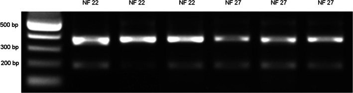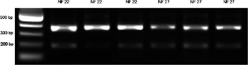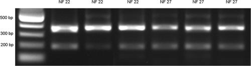 Xenopus laevis DNA amplified following ZEG extraction. DNA extracted from devitellined X. laevis embryos at NF 22 (Lane 2‐4) and NF 27 (Lane 5‐7), was amplified with primer pair XLA (380 bp amplicon) and the PCR product resolved on a 1% agarose gel. The lower band is non‐specific |