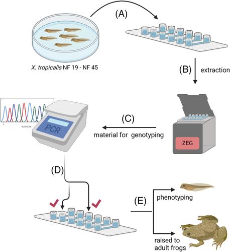 FIGURE 1. Schematic of the extraction procedure used to effectively genotype embryos. A, Embryos in 0.05X MMR are loaded individually per well of the extraction chip. B, The chip is placed in the ZEG unit and run at 1.8 V for 7.5 min. C, The extracted material is used directly for PCR genotyping and downstream analyses. D, The outcome of the analysis allows identification of embryos of interest, (E) which are then selectively used for phenotyping and/or allowed to develop into adulthood |