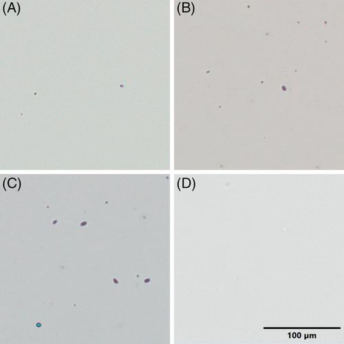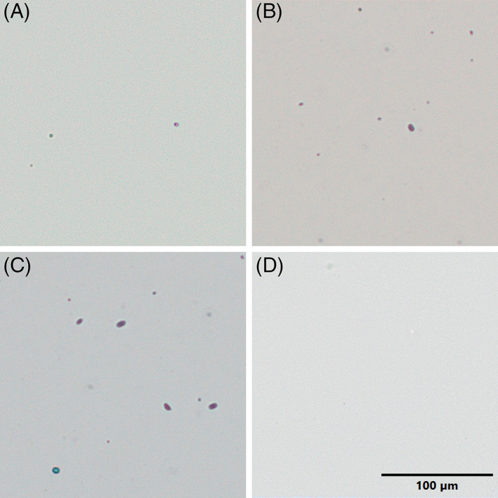 FIGURE 2. Cellular material extracted using the ZEG. Following ZEG extraction of Xenopus tropicalis embryos, selected samples across a range of DNA concentrations were mixed with Trypan Blue (1:1) and imaged; (A) NF 25 ‐ known DNA concentration 32 ng/μL, (B) NF 25 ‐33 ng/μL, (C) NF 19 ‐ 63 ng/μL, and (D) 0.05X MMR (blank). Few Trypan Blue stained (dead) cells and fragments as well as occasional Trypan‐excluding, presumably live cells, are visible in preparations. Scale bar = 100 μm. |