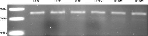 FIGURE 3. Amplification of ZEG‐extracted DNA from NF 19 Xenopus tropicalis embryos. DNA was extracted from NF 19 embryos devitellined (lane 2‐4) and the same stage embryos with vitelline membrane left in situ (M; lane 5‐7). A 260 bp region was amplified successfully as shown resolved on a 1% agarose gel |