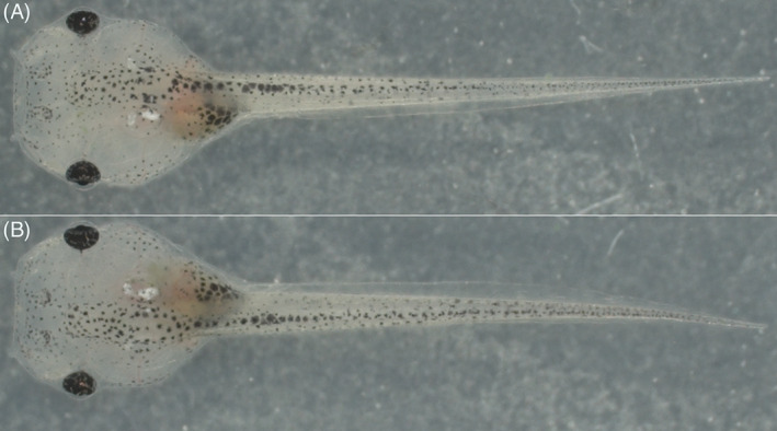 FIGURE 5. Example images of Xenopus tropicalis tadpole. Control, non‐extracted (A) and post‐ZEG extraction (B) at NF 46 are shown. Animals were imaged (25X) and show no visible phenotypic differences |