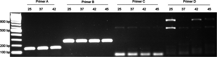 FIGURE 6. Fragments of different sizes amplified to determine integrity of ZEG‐extracted gDNA. DNA was ZEG extracted at NF 25, NF 37, NF 42, and NF 45, amplified with primer pair A (150 bp), B (260 bp), C (550 bp) & D (800 bp) and resolved on a 1% agarose gel. Contrast was adjusted to reveal the low intensity spurious bands |