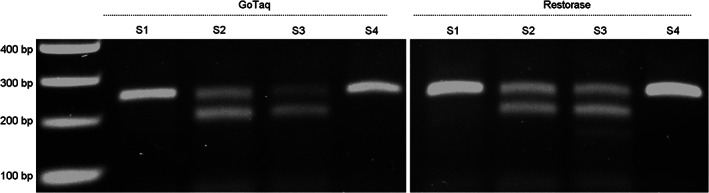 FIGURE 11. T7 endonuclease I assay performed with Restorase amplified DNA. Xenopus tropicalis embryos were subjected to CRISPR/Cas9 gene editing. DNA was extracted using ZEG at NF 37 and a 260 bp target region was amplified with GoTaq G2 Polymerase and Restorase DNA Polymerase. The amplicons were tested for induced mutations by T7 endonuclease I assay. Restorase improved amplification while the mutant samples 2 and 3 were accurately detected with both GoTaq and Restorase amplified DNA |