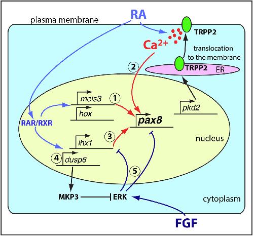 Fig. 8. Working model based on present data and previously published results (Cartry et al., 2006; Cirio et al., 2011; Colas et al., 2008; Futel et al., 2015; Le Bouffant et al., 2012) illustrating the mechanisms that control pax8 expression in the kidney field. The present data (1) show that meis3 and hox are RA targets, and are involved in the direct regulation of pax8. They are cooperating with other RA-dependent inputs such as lhx1 (Cirio et al., 2011) (3), and a yet unidentified mechanism dependent on RA-dependent intracellular calcium signaling (Futel et al., 2015) (2). The FGF/erk pathway was previously shown to inhibit pax8 expression (Colas et al., 2008) (5) and can be negatively regulated by MKP3 that is encoded by dups6, another RA target (Le Bouffant et al., 2012)(this study) (4). ER: endoplasmic reticulum.
