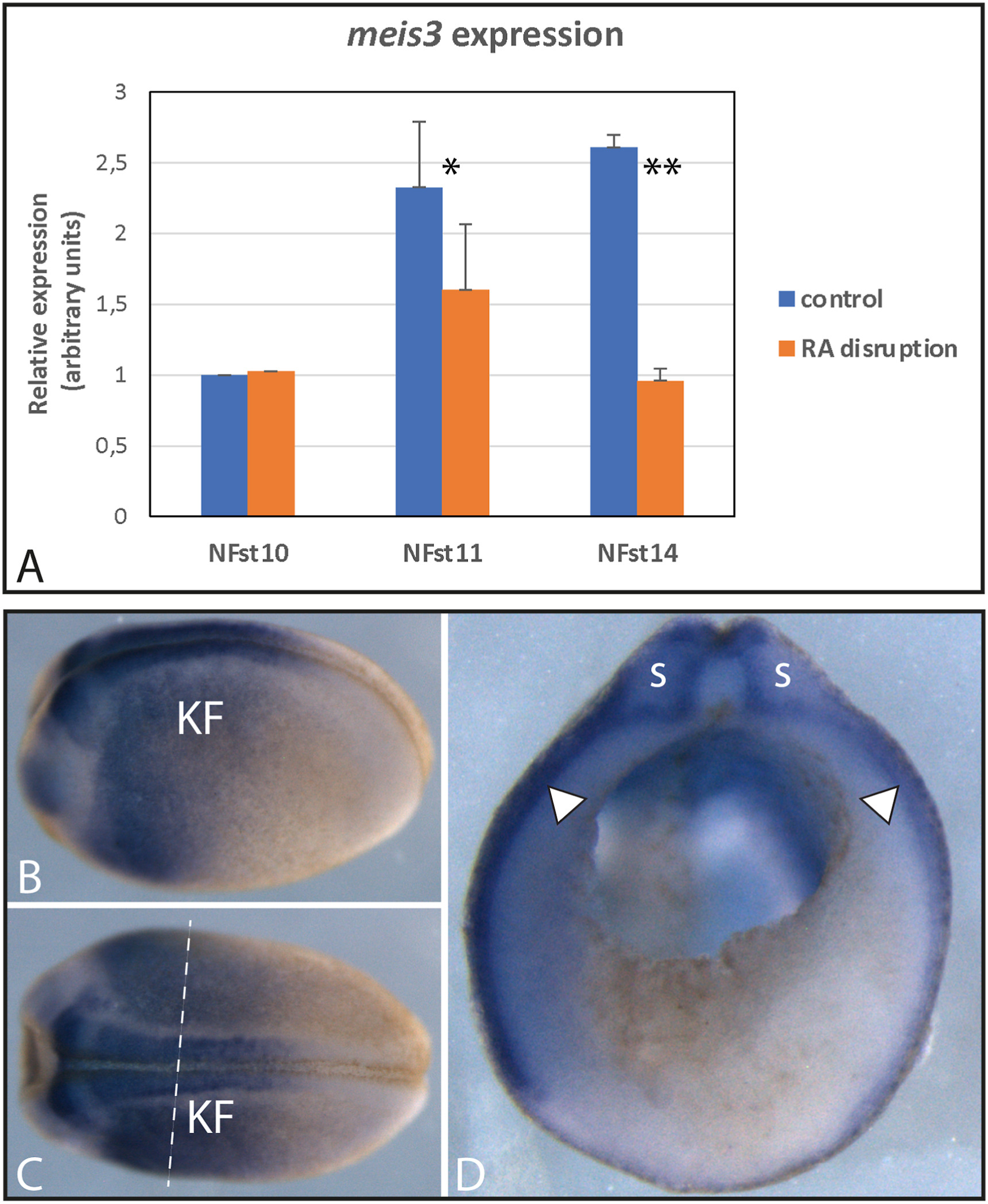 Fig. 2. Targeted meis3 depletion results in the inhibition of pax8 expression in the kidney field. A. RT-qPCR analysis of meis3 expression in LMZ explants in response to RA depletion. Expression of meis3 is shown as relative expression to odc. Meis3 expression appears to be dependent on RA from midgastrula stage onward (NFst11) and at early neurula stage (NFst14). ∗p < 0.05, ∗∗p < 0.01 (paired Student's t-test). Error bars correspond to SEM. B-D. ISH with meis3 antisense probe. Late neurula stage (NFst18). Lateral (B) and dorsal (C) views. D. Embryo bisected according to the dotted line shown in C. Meis3 is expressed in dorsal and lateralmesoderm (arrowheads), including the kidney field (KF). s: somite.
