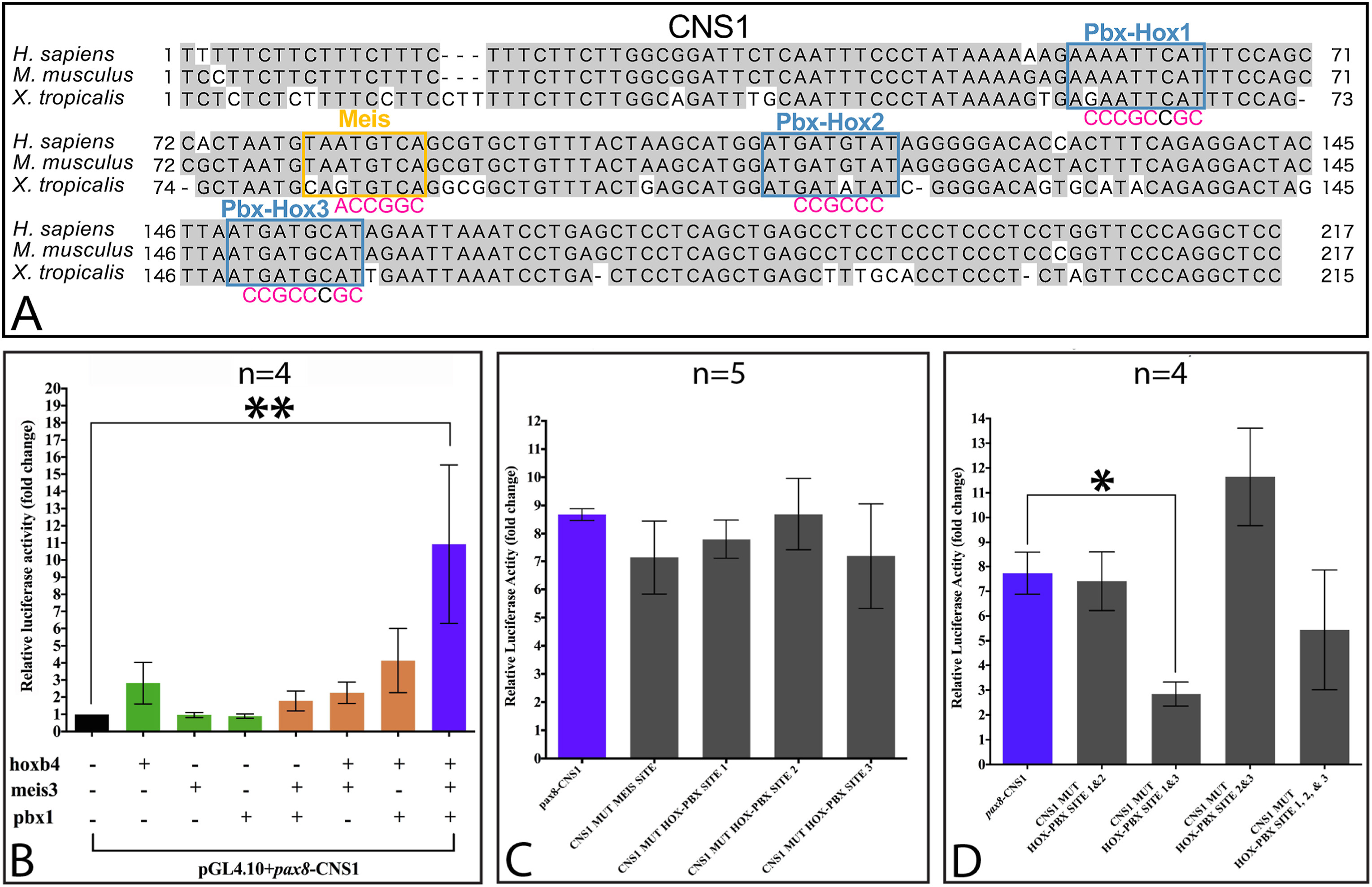 Fig. 6. Transactivation of Pax8-CNS1 by Xenopus hoxb4 combined with meis3 and pbx1. A. Alignment of pax8-CNS1 sequences from the human (hg38, chr2: 113,341,953–113,342,169), mouse (mm10, chr2: 24,539,076–24,539,292), and frog (Xenopus tropicalis; xenTro10, chr3: 125,792,358–125,792,572) with three highlighted conserved putative Pbx-Hox binding motives (blue), and one Meis (orange). Nucleotides identical in two or three sequences are shaded in grey. Mutations tested for every site are shown in red. Note that the putative binding motives mapped here show close similarity to the consensus binding sequences of Pbx-Hox (5′-ATGATTNATNN-3′) or Meis (5′-TGACAGST-3′) (Chang et al., 1996, 1997). B. Reporter expression measured for HEK293 cells transfected with pax8CNS1-luc, and various combinations of plasmids allowing expression of Xenopus hoxb4, meis3 or pbx1 indicated in the bottom of the figure. Values are expressed as fold changes relative to HEK293 cells transfected with pax8CNS1-luc alone. A significant increase of reporter expression is only observed with cells expressing a combination of hoxb4, meis3 and pbx1. Other combinations tested do not elicit any significant increase of reporter expression. ∗∗p < 0.01 (Dunn's multiple comparison test after Kruskal-Wallis test). C. Analysis of mutations of single Pbx-Hox and Meis motifs in transactivation assays. HEK293 cells were transfected with the three plasmids allowing expression of hoxb4, meis3 and pbx1 combined with wild-type pax8CNS1-luc, pax8CNS1mut-lucMeis, pax8CNS1mut-lucHP1, pax8CNS1mut-lucHP2 or pax8CNS1mut-lucHP3. Values are expressed as fold changes relative to HEK293 cells transfected with wild-type pax8CNS1-luc. None of the single mutation tested significantly affected transactivation. D. Analysis of multiple mutations of Pbx-Hox motifs in transactivation assays. HEK293 cells were transfected with the three plasmids allowing expression of hoxb4, meis3 and pbx1 combined with wild-type pax8CNS1-luc, pax8CNS1mut-lucHP1+2, pax8CNS1mut-lucHP1+3, pax8CNS1mut-lucHP2+3 or pax8CNS1mut-lucHP1+2 + 3. Values are expressed as fold changes relative to HEK293 cells transfected with wild-type pax8CNS1-luc. Combining mutation of Pbx-Hox 1 and 3 motifs results in a strong decrease of reporter expression, pointing to these two sites as active hox-Pbx binding sites. ∗p < 0.05 (Dunn's multiple comparison test after Kruskal-Wallis test).
