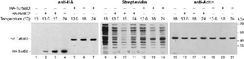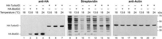 Fig. 3. Biotinylation by TurboID can occur at multiple temperatures in Xenopus embryos. Experiments were performed as in Fig. 1A with the same mRNAs as in 1B. Embryos were cultured at 13.6, 18, or 24C before harvesting proteins for analysis. Immunoblot analysis with an anti-HA antibody was used to monitor the expression of injected mRNAs (Lanes 1–7). Streptavidin-HRP assayed self-biotinylation of each enzyme as a readout of enzyme activity (Lanes 8–14). Blots were stripped and re-probed with anti-actin antibody to assess sample loading (Lanes 15–21). Open triangles indicate where biotinylation of BioID2 is to be expected. Figure is representative of three biological replicates.