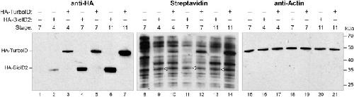 Fig. 4. Biotinylation by TurboID occurs rapidly in Xenopus embryos. Experiments were performed as in Fig. 1A with the same mRNAs as in 1B. Embryos were allowed to develop to stage 4, 7, or 11 before harvesting. As in previous figures, immunoblot analysis with an anti-HA antibody was used to monitor the expression of injected constructs (Lanes 1–7). Streptavidin-HRP assayed self-biotinylation of each enzyme as an indication of enzyme activity (Lanes 8–14). Blots were stripped and re-probed with anti-actin antibodies to assess sample loading (Lanes 15–21). Open triangles indicate where biotinylation of BioID2 is to be expected. Figure is representative of three biological replicates.