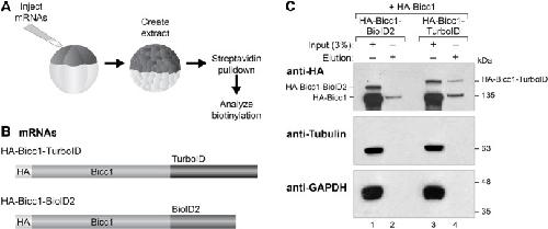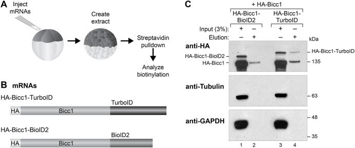 Fig. 5. Protein-protein interactions are efficiently identified with TurboID fusion proteins. (A) Assay for pulldown of biotinylated proteins post proximity-labeling with Bicc1-biotin ligase fusion proteins. Two-cell Xenopus embryos were injected with mRNA encoding either HA-Bicc1-BioID2 or HA-Bicc1-TurboID fusion proteins along with HA-Bicc1. When embryos reached stage 7, protein was extracted for streptavidin purification of biotinylated proteins. (B) Diagrams of HA-Bicc1-BioID2 or HA-Bicc1-TurboID fusion proteins. (C) Immunoblot analysis of streptavidin-purified proteins with an anti-HA antibody was used to observe pulldown, and hence biotinylation, of HA-Bicc1, as well as self-biotinylation of the fusion proteins (Lanes 2 & 4). Blots were stripped and re-probed with anti-tubulin and anti-GAPDH antibodies as a specificity controls. Figure is representative of three biological replicates.