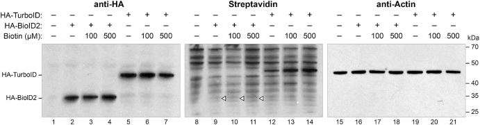 Fig. 2. TurboID requires no exogenous biotin. Experiments were performed as in Fig. 1A with the same constructs used in 1B. Embryos were cultured with 0, 100, or 500 μM supplemental biotin added to culture media. Immunoblot analysis with an anti-HA antibody was used to monitor the expression of injected mRNA (Lanes 1–7). Streptavidin-HRP assayed self-biotinylation of each enzyme as a readout of enzyme activity (Lanes 8–14). Blots were stripped and re-probed with anti-actin antibody to assess sample loading (Lanes 15–21). Open triangles indicate where biotinylation of BioID2 is to be expected. Figure is representative of three biological replicates.