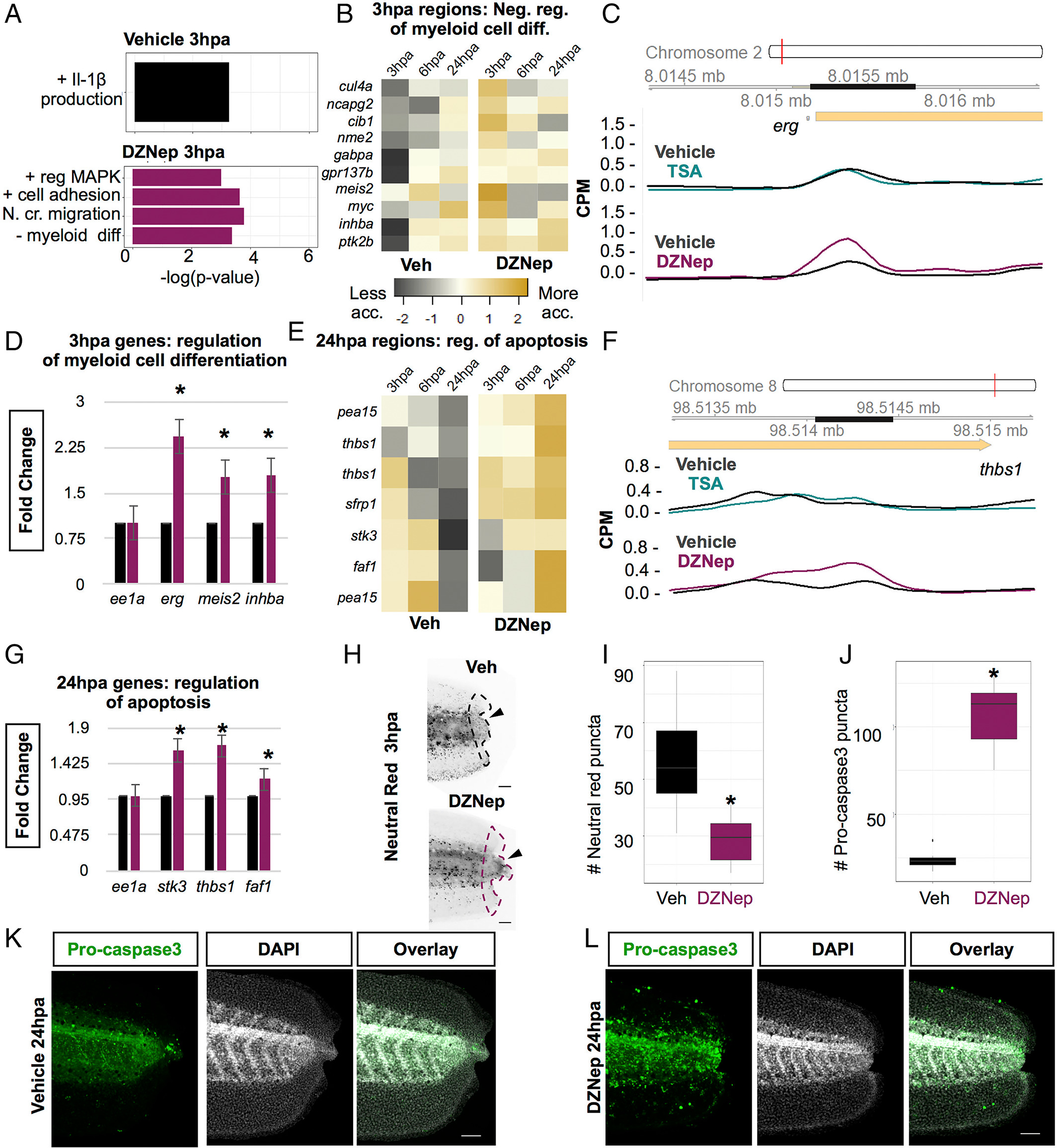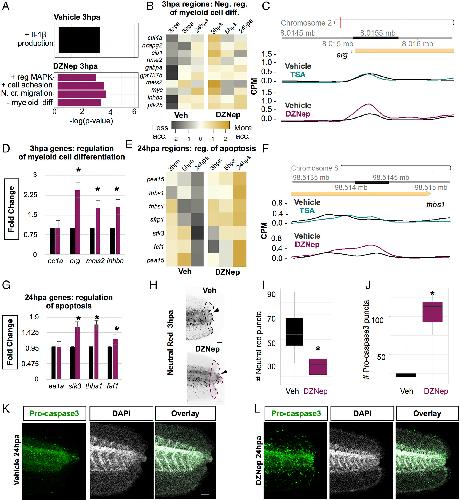 EZH2 inhibition regulates early immune response in regeneration which alters later apoptosis levels. (A) Selected GO terms enriched at 3 hpa called from regions with increased accessibility in the vehicle relative to DZNep (black) or called from regions that had increased accessibility in DZNep relative to the vehicle (maroon). (B) Differential accessibility heat map of genes assigned to the GO term negative regulation of myeloid cell differentiation at 3 hpa. (C) Representative gviz track of both TSA (teal) and DZNep (maroon) treated regenerates with their respective vehicle controls (both sets of controls are black but should be noted they are separate data sets) at 3 hpa showing a differentially accessible ATAC-seq peak (dark bar) associated with a gene with differential expression in the DZNep treatment. (D) RT-qPCR fold expression of selected genes assigned to negative regulation of myeloid differentiation GO terms relative to ee1a in regenerating tissue. Data represents the mean ± SEM (*p < .05 two-tailed t-test). (E) Differential accessibility heat map of genes assigned to the GO term regulation of apoptosis at 24 hpa. (F) Representative gviz track of both TSA (teal) and DZNep (maroon) treated regenerates with their respective vehicle controls (both sets of controls are black but should be noted they are separate data sets) at 24 hpa showing a differentially accessible ATAC-seq peak (dark bar) associated with a gene with differential expression in the DZNep treatment. (G) RT-qPCR fold expression of selected genes assigned to regulation of apoptosis GO term relative to ee1a in regenerating tissue. Data represents the mean ± SEM (*p < .05 two-tailed t-test). (I) Neutral red stain of live tadpoles at 3 hpa in vehicle or DZNep treated regenerates (scale bar = 250 μm). (I) Box plots of the quantification of neutral red puncta in vehicle or DZNep treated regenerates at 3 hpa (*p < .05 two-tailed t-test, n = 8 for each condition). (J) Quantification of cleaved pro-caspase3 puncta (*p < .05 two-tailed t-test, n = 7 for each condition). (K–L) Cleaved pro-caspase3 immunofluorescence of 24 hpa regenerates (scale bar = 250 μm) (K) Vehicle, (L) DZNep. [Color figure can be viewed at wileyonlinelibrary.com] |