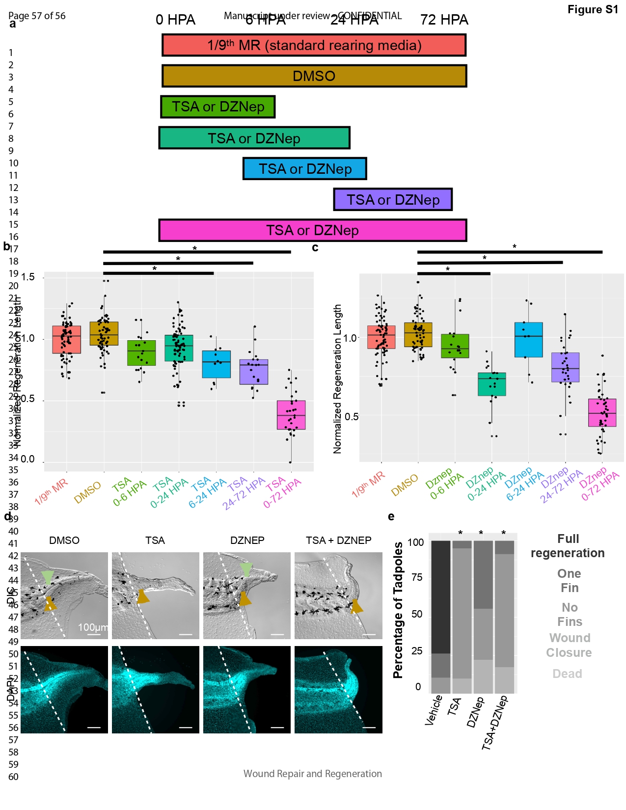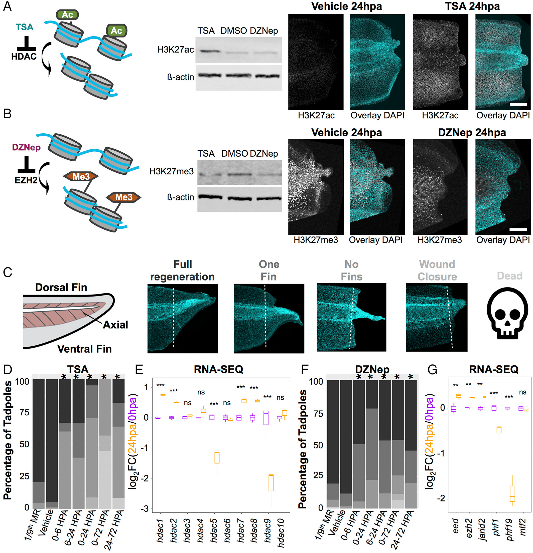 Figure S1. HDAC and EZH2 activity are necessary for regeneration of tissues. (A) Experimental schematic of treatment windows during regeneration. (B) Tail regeneration length during windows of TSA treatment. (C) Tail regeneration length during windows of DZNep treatment. (B,C) *p < .05 ANOVA with Tukey's post hoc. (D) DIC and DAPI images of regenerating tails; (E) Tail regeneration phenotypes during various drug treatments. *p < .05 chi-square test |