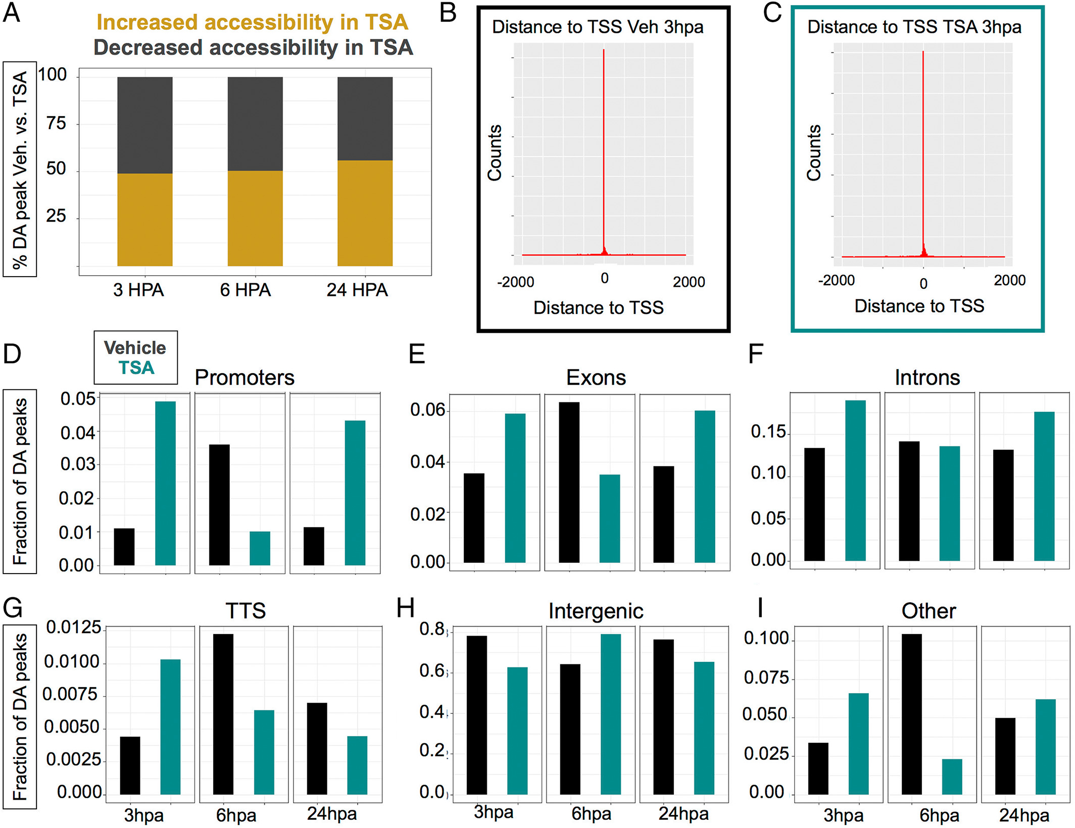 Figure S2. Quality metrics of TSA and Vehicle control ATAC-seq datasets. (A–I) 0 hpa dark grey, uninjured tails dark grey, vehicle black, TSA treated teal. (A) Total reads for each sequencing library. (B) Total reads aligned for each library. (C) percentage of reads aligned. (D) Number of peaks called by MACS2. (E) Peak versus alignment. (F) Number of peaks during regeneration time points. (G–I) Differentially accessible peaks distance to TSS. (J) Top 10 enriched transcription factor binding motifs in at 3 hpa in (left) vehicle treated condition relative to TSA and (right) vehicle treated relative to DZNep treatment. (K) Top 10 enriched transcription factor binding motifs in 6 hpa in (left) vehicle treated condition relative to TSA and (right) vehicle treated relative to DZNep treatment. (L) Top 10 enriched transcription factor binding motifs at 24 hpa in (left) vehicle treated condition relative to TSA and (right) vehicle treated relative to DZNep treatment. |