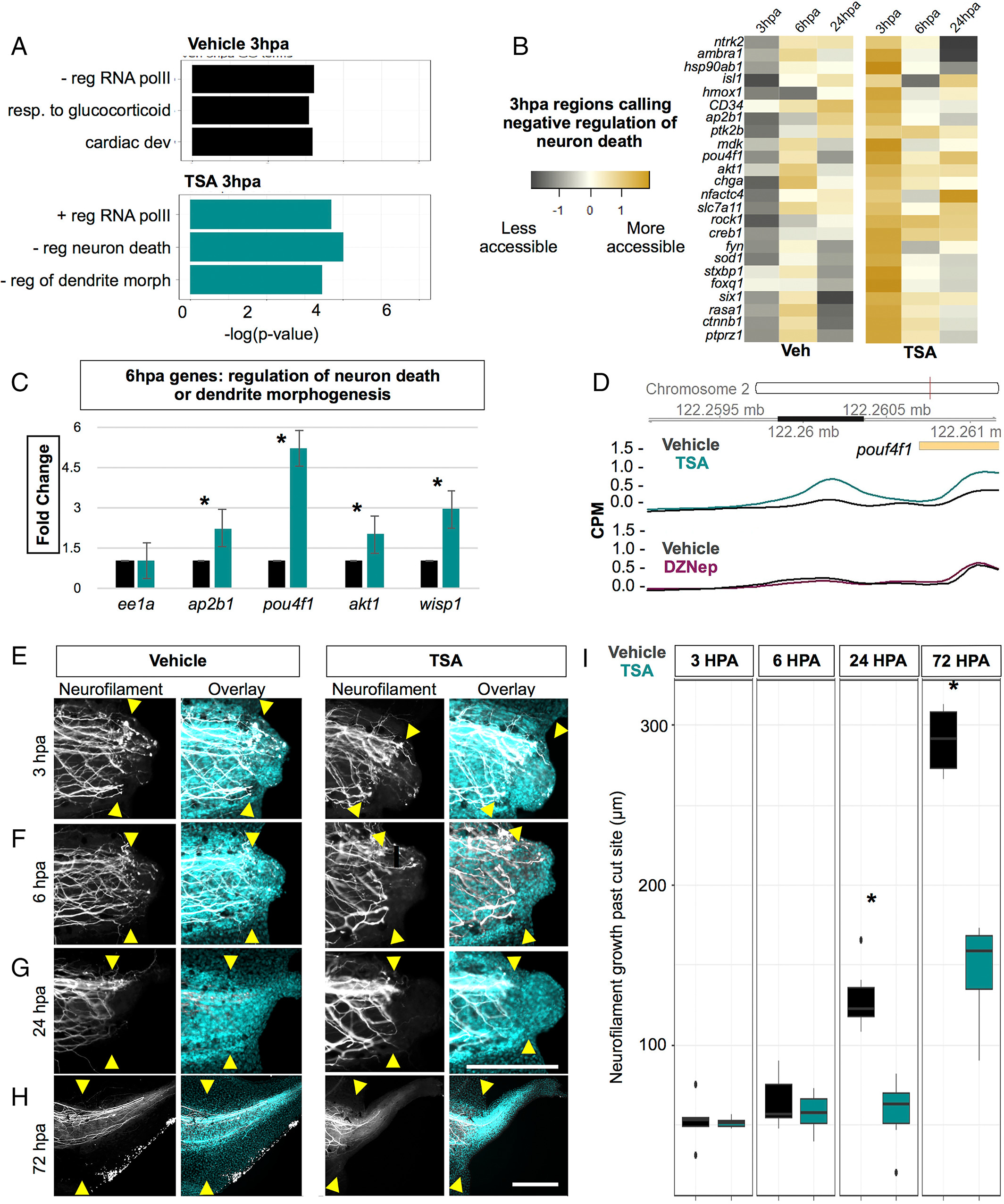 Neuronal regeneration is impaired by early HDAC inhibition. (A) Selected GO terms enriched at 3 hpa called from regions with increased accessibility in the vehicle relative to TSA (black) or called from regions that had increased accessibility in TSA relative to the vehicle (teal). (B) Differential accessibility heat map of genes assigned to the GO term negative regulation of neuron death or dendrite morphogenesis at 3 hpa. (C) RT-qPCR fold expression of selected genes assigned to neural associated GO terms relative to ee1a in regenerating tissue. Data represents the mean ± SEM (*p < .05 tailed t-test). (D) Representative gviz track of both TSA (teal) and DZNep (maroon) treated regenerates with their respective vehicle controls (both sets of controls are black but should be noted they are separate data sets) at 3 hpa showing a differentially accessible ATAC-seq peak (dark bar) associated with a gene with differential expression in the TSA treatment. (E–H) Time course of neurofilament immunofluorescence (white) in vehicle control tadpoles or TSA-treated tadpoles at 3 (E), 6 (F), 24 (G), and 72 hpa (H). Yellow arrowheads indicate amputation plane. Scale bars = 250 μm, panel H shows a region double the size of (E–G) to show full regeneration of neurofilament. (I) Box plots of neurofilament outgrowth past the amputation plane in vehicle (black), or TSA-treated tadpoles (teal) (*p < .05, two-tailed t-test, n = 5–7 for each condition). [Color figure can be viewed at wileyonlinelibrary.com] |