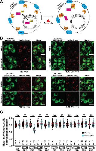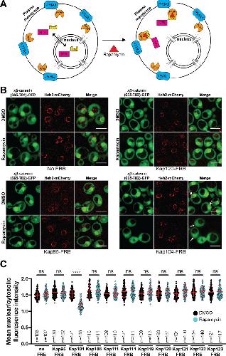 Figure 3—figure supplement 2. Anchor-Away cloning strategy in Saccharomyces cerevisiae.(A) Schematic diagram of FKBP-rapamycin binding (FRB) tagging to individual endogenous nuclear transport receptors (NTRs) by homologous recombination. (B) Screening of NTR-FRB strains by colony PCR. Primers are listed in Supplementary file 3. (C) Positive NTR-FRB strains from the colony PCR in (B) were further tested for cell growth as some NTRs are essential for survival. No FRB and DMSO were used a negative controls. |