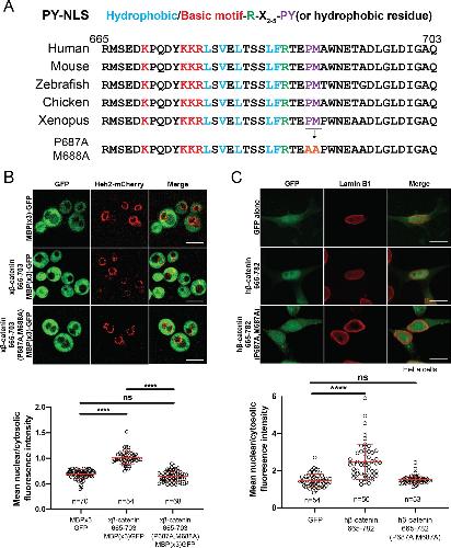 Figure 4. β-catenin contains a PY-NLS that is required for nuclear import.(A) Conservation of amino acid sequences that conform to the PY-NLS consensus (top, from Soniat and Chook, 2015) in the C-terminus of β-catenin. (B) Deconvolved fluorescence images of wildtype yeast cells expressing MBP(x3)-GFP tagged with the Xenopus β-catenin nuclear localization signal (NLS) (665-703) and also an NLS that contains the PM to AA mutation (top). Untagged MBP(x3)-GFP was used as a control. Plot of the ratio of mean nuclear to cytoplasmic fluorescence intensity from a single experiment (bottom). Scale bar is 5 µm. (C) Representative fluorescence image of HeLa cells expressing human β-catenin (665-782) or the PM to AA mutant version (top). LaminB1 was labeled to locate the nuclear envelope. GFP alone was used as a control. Plot of the ratio of mean nuclear to cytoplasmic fluorescence intensity from three experiments (bottom). Scale bar is 15 µm. p-Values are from unpaired two-tailed t-test where ns is p>0.05 and ****p<0.0001 for both (B) and (C). The data is uploaded as Figure 4—source data 1. Figure 4—source data 1. Source data related to Figure 4. |