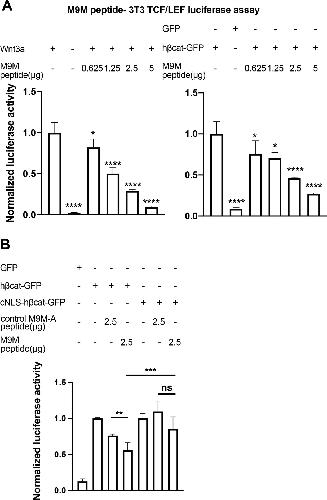 Figure 7. The M9M peptide inhibits Wnt signaling.Wnt signaling was activated by Wnt3a (A, left), human β-catenin-GFP overexpression (A, right and B), or cNLS-human β-catenin-GFP (B). No Wnt3a or GFP overexpression were used as negative controls. Experiments were performed in triplicate (A) or duplicate in two independent experiments (B). p-Values are from unpaired two-tailed t-test where ns is p>0.05, p<0.05 (*), 0.0021 (**), 0.0002 (***), and p<0.0001 (****). The data is uploaded as Figure 7—source data 1. Figure 7—source data 1. Source data related to Figure 7. |
