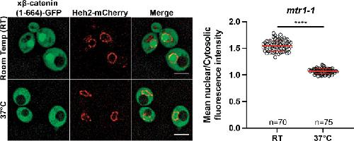 Figure 2—figure supplement 1. β-catenin (1-664) localizes to the nucleus in a RanGTPase dependent manner in Saccharomyces cerevisiae.Representative deconvolved fluorescence image of xβ-catenin (1-664)-GFP in the RanGEF mutant (mtr1-1) strain at room temperature or 37°C that co-expresses Heh2-mCherry as a nuclear envelope marker (left). The ratio of mean nuclear to cytosolic fluorescence intensity was measured in the mtr1-1 strain from three independent replicates (right). Red bar indicates the mean value with the SD. p-Values are from unpaired two-tailed t-test where ns is p>0.05 and **** is p<0.0001. Scale bar is 5 µm. The data is uploaded as Figure 2—figure supplement 1—source code 1. Figure 2—figure supplement 1—source code 1. Source data related to Figure 2—figure supplement 1. |