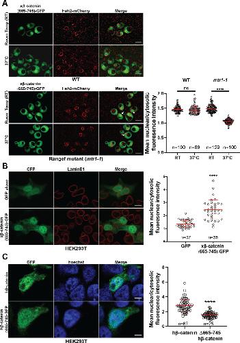 Figure 2—figure supplement 2. Ran dependence of the β-catenin (665-745)-GFP in the Saccharomyces cerevisiae and its requirement for nuclear localization in HEK293T cells.(A) Deconvolved fluorescence image of Xenopus β-catenin-(665-745)-GFP in the wildtype (top left) and RanGEF mutant (mtr1-1) (bottom left) strain at room temperature (RT) or 37°C that co-expresses Heh2-mCherry as a nuclear envelope marker. White arrows indicate the nuclear compartment. The ratio of mean nuclear to cytosolic fluorescence intensity from a single experiment (right). Scale bar is 5 µm. (B) Representative image of HEK293T cells expressing Xenopus β-catenin (665-745)-GFP. LaminB1 was labeled to locate the nuclear envelope. GFP was used as a control. Ratio of nuclear to cytoplasmic intensities from two independent replicates (right). Scale bar is 10 µm. (C) Representative image of HEK293T expressing full-length human β-catenin GFP and human β-catenin (Δ665-745)-GFP. Ratio of nuclear to cytoplasmic intensities from three independent replicates (right). Hoechst was labeled to locate the nuclear compartment. Scale bar is 6 µm. p-Values are from unpaired two-tailed t-test where ns is p>0.05 and ****p<0.0001. The data is uploaded as Figure 2—figure supplement 2—source data 1. Figure 2—figure supplement 2—source data 1. Source data related to Figure 2—figure supplement 2. |