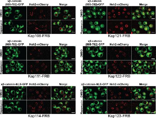 Figure 3—figure supplement 1. Sub-cellular localization of Xenopus β-catenin (665-782)-GFP in Anchor-Away strains in Saccharomyces cerevisiae.Representative deconvolved fluorescence image of xβ-catenin (665-782)-GFP treated with DMSO (carrier) or rapamycin in the indicated nuclear transport receptor (NTR)-FKBP-rapamycin binding (FRB) strain. Heh2-mCherry was used as a nuclear membrane marker. Scale bar is 5 µm. |