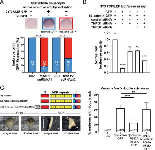 Figure 6. TNPO1/2 and the β-catenin nuclear localization signal (NLS) are required for Wnt signaling in vivo.(A) Depletion of tnpo1 and tnpo2 using two different pairs of non-overlapping sgRNAs represses gfp expression in Xenopus tropicalis Tg(pbin7Lef-dGFP) embryos at stage 10. Key used to quantify embryos with whole mount in situ hybridization (WMISH) signal (blue – normal gfp signal nd red – reduced gfp signal). Uninjected control (UIC) embryos were used as a negative control. (B) siRNA mediated TNPO1 and/or TNPO2 knockdown reduces luciferase activity in mouse embryonic fibroblasts that harbor a stable integration of luciferase under the control of TCF/LEF promoters. Wnt signaling was activated by human β-catenin-GFP overexpression. Control siRNA and GFP were used as negative controls. Experiments were performed in triplicate. (C) Schematic diagram of three β-catenin constructs used in the double axis assay in Xenopus laevis. ** indicates P687A, M688A substitutions (top left). Dorsal views of X. laevis embryos with anterior to the top (bottom left). Dotted lines indicate the embryonic axis, and the white arrows indicate the head. Histogram of the percent of embryos with secondary axes from three independent replicates. p-Values are from Fisher’s exact test (A) and (C) and unpaired two-tailed t-test (B) where ns is p>0.05, p<0.05 (*), 0.0021 (**), 0.0002 (***), and p<0.0001 (****).The data is uploaded as Figure 6—source data 1. Figure 6—source data 1. Source data related to Figure 6. |