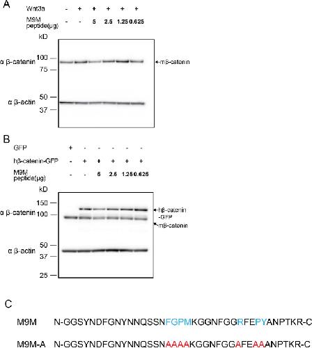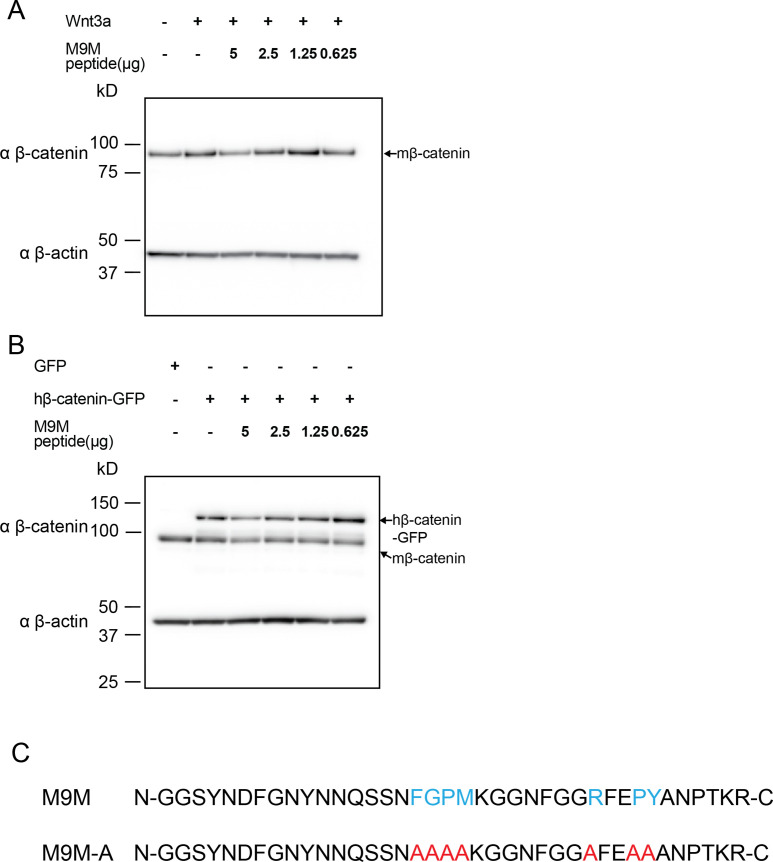 Figure 7—figure supplement 1. Western blots of β-catenin from 3T3 TCF/LEF luciferase assays with M9M peptide treatment.Western blot data for M9M peptide treatment in mouse embryonic fibroblast Wnt reporter cell lines. Wnt signaling is activated by (A) Wnt3a or (B) human β-catenin. (C) PY-NLS residues (blue) in M9M peptide were mutated to alanine (red) to create M9M-A peptide. |