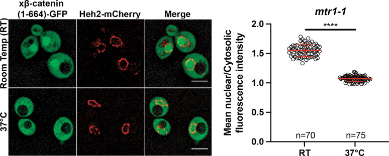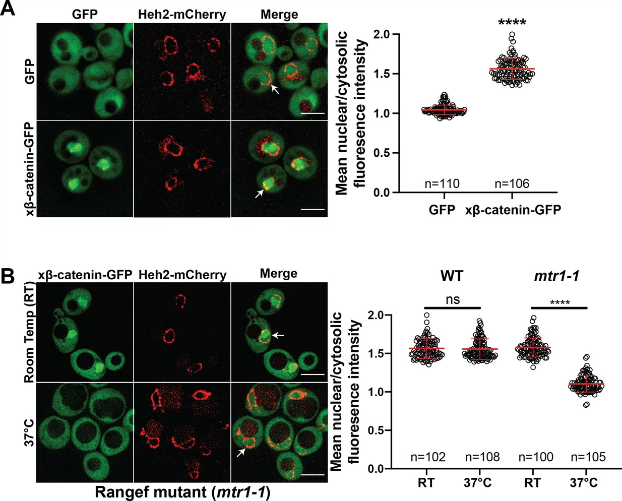 Figure 1 β-catenin requires a functional Ran cycle to accumulate in the nucleus of Saccharomyces cerevisiae. (A) Representative deconvolved fluorescence images of xβ-catenin-GFP in a wildtype yeast strain that expresses Heh2-mCherry to label the nucleus (left). White arrows indicate the nuclear compartment. Plot showing the quantification of mean nuclear to cytosolic fluorescence intensity from 30 to 40 cells from three independent replicates (right). (B) Representative deconvolved fluorescence images of xβ-catenin-GFP in the RanGEF mutant (mtr1-1) strain at room temperature or 37°C that co-expresses Heh2-mCherry as a nuclear envelope marker (left). The ratio of mean nuclear to cytosolic fluorescence intensity was measured in the wildtype or mtr1-1 strain from 30 to 35 cells from three independent replicates (right). Scale bar is 5 μm in (A) and (B). Red bar indicates the mean value with the SD. p-Values are from unpaired two-tailed t-test where ns is p>0.05, and ****p<0.0001 for both (A) and (B). The data is uploaded as Figure 1—source data 1. |
