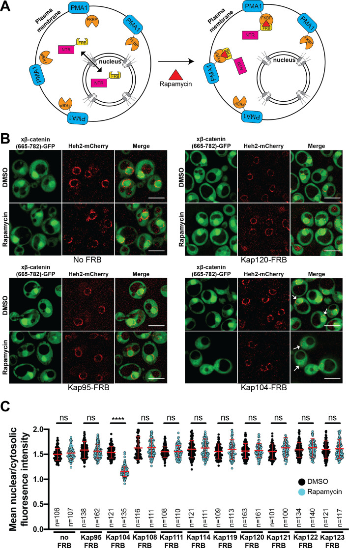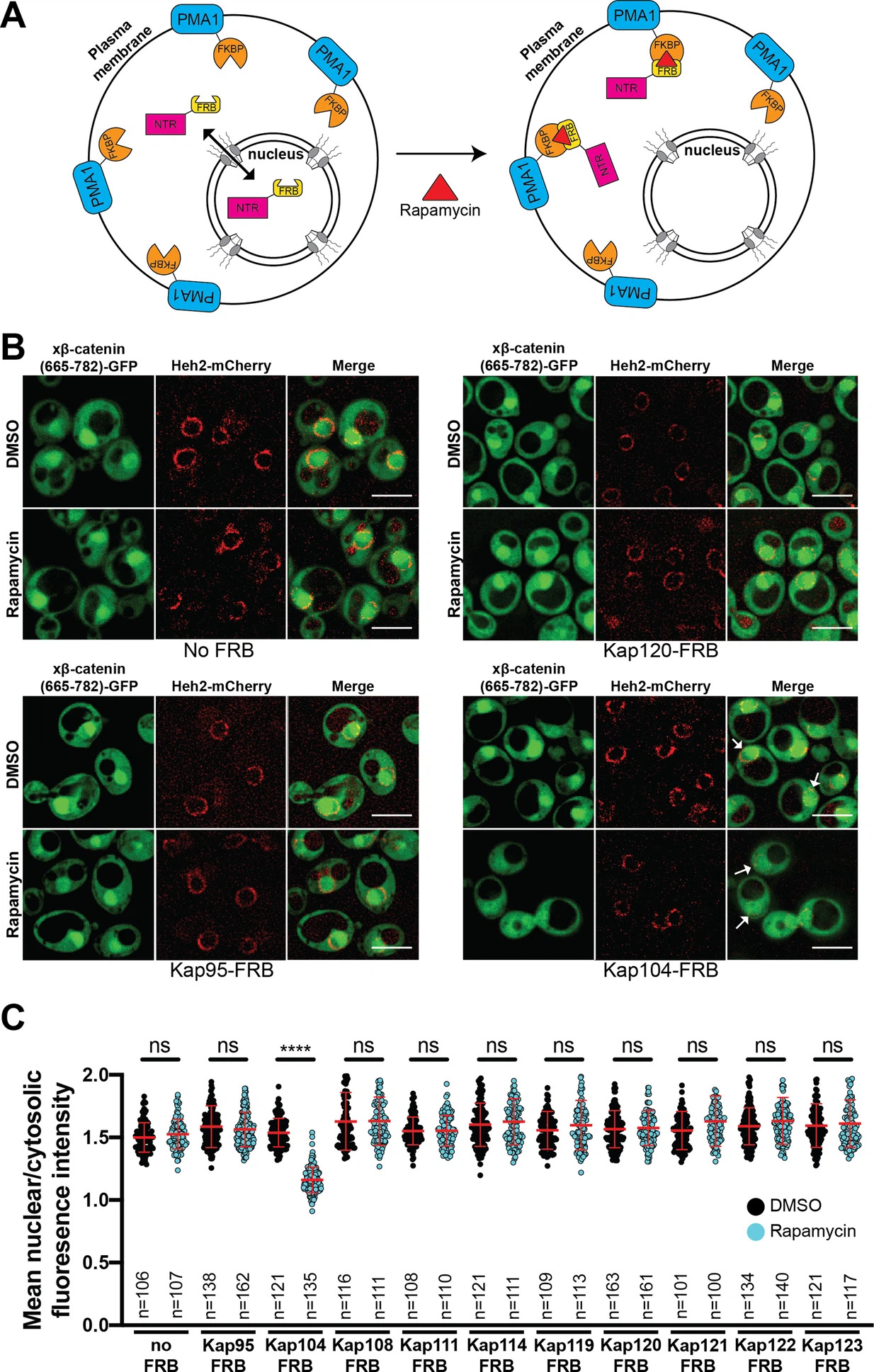 Figure 3 with 2 supplements Kap104 is specifically required for β-catenin nuclear accumulation in Saccharomyces cerevisiae. (A) Schematic of the Anchor-Away assay mediated by the rapamycin-induced dimerization of nuclear transport receptor (NTR)-FKBP-rapamycin binding (FRBP and Pma1-FKBP12). Pma1 is a plasma membrane ATPase. (B) Deconvolved fluorescence images of cells with indicated FRB fusions expressing Xenopus β-catenin (665-782)-GFP treated with DMSO (vehicle) or rapamycin for 15 min. Heh2-mCherry was used as a nuclear envelope marker. White arrows indicate the nucleus. Scale bar is 5 µm. (C) Plot showing the ratio of mean nuclear to cytosolic fluorescence intensity of Xenopus β-catenin (665-782)-GFP in the 10 NTR-FRB strains treated with DMSO or rapamycin from 30 to 40 cells from three independent replicates. Red bar indicates the mean value with the SD. Experiments were performed three times. p-Values are from unpaired two-tailed t-test where ns is p>0.05 and ****p<0.0001. The data is uploaded as Figure 3—source data 1. |