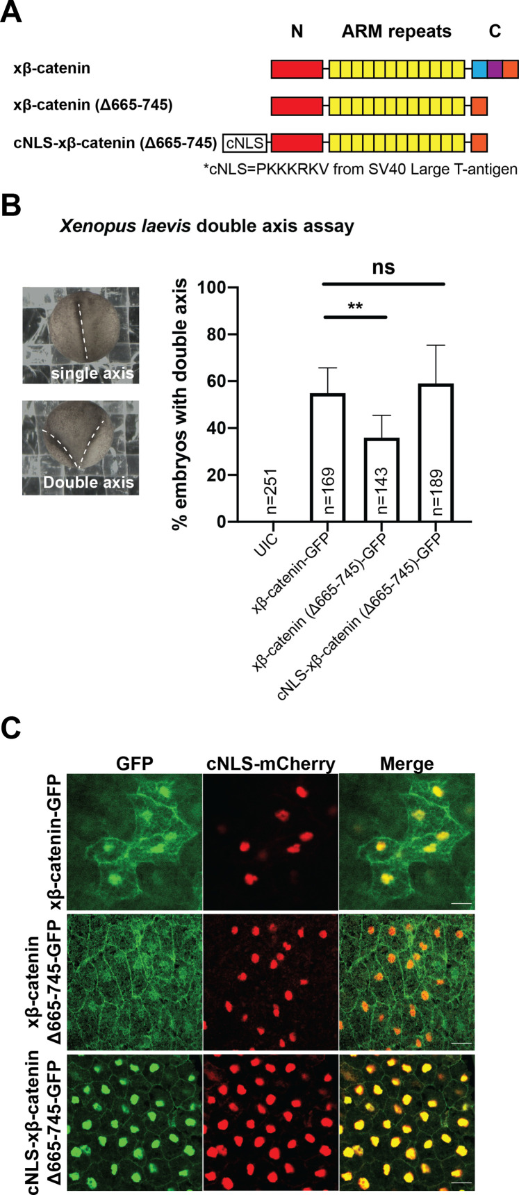 Figure 2—figure supplement 3. Residues 665–745 of β-catenin are required to induce secondary axes in Xenopus laevis.(A) Schematic diagram of Xenopus β-catenin constructs. (B) Double axes were scored in st 19 embryos and viewed dorsally with anterior to the top (left). Data from three independent replicates depicted in histogram (right). p-values are from Fisher’s exact test where ns is p>0.05, p<0.05 (*), and 0.0021 (**). (C) Subcellular localization of xβ-catenin-GFP, xβ-catenin (Δ665-745)-GFP, or cNLS-xβ-catenin (Δ665-745)-GFP in the dorsal blastopore lip of stage 10 X. laevis embryos. cNLS-mCherry mRNA was co-injected to mark the nucleus. Scale bar is 30 µm. |