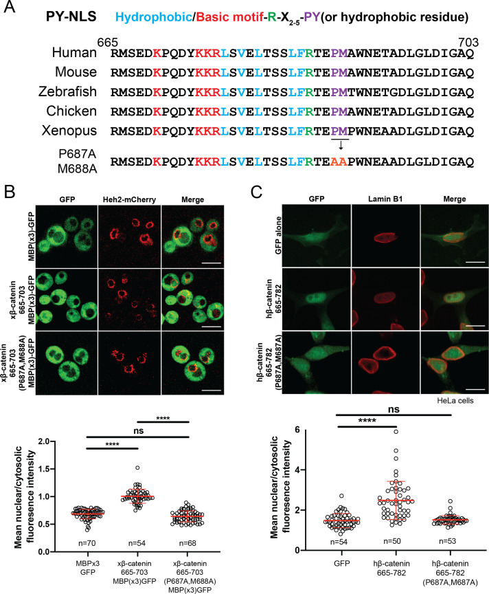 Figure 4 β-catenin contains a PY-NLS that is required for nuclear import. (A) Conservation of amino acid sequences that conform to the PY-NLS consensus (top, from Soniat and Chook, 2015) in the C-terminus of β-catenin. (B) Deconvolved fluorescence images of wildtype yeast cells expressing MBP(x3)-GFP tagged with the Xenopus β-catenin nuclear localization signal (NLS) (665-703) and also an NLS that contains the PM to AA mutation (top). Untagged MBP(x3)-GFP was used as a control. Plot of the ratio of mean nuclear to cytoplasmic fluorescence intensity from a single experiment (bottom). Scale bar is 5 µm. (C) Representative fluorescence image of HeLa cells expressing human β-catenin (665-782) or the PM to AA mutant version (top). LaminB1 was labeled to locate the nuclear envelope. GFP alone was used as a control. Plot of the ratio of mean nuclear to cytoplasmic fluorescence intensity from three experiments (bottom). Scale bar is 15 µm. p-Values are from unpaired two-tailed t-test where ns is p>0.05 and ****p<0.0001 for both (B) and (C). The data is uploaded as Figure 4—source data 1. |