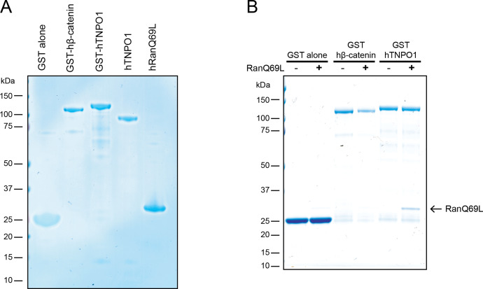 Figure 5—figure supplement 1. TNPO1 selectively binds to RanGTP in vitro.(A) Generation of recombinant GST fusions of human β-catenin and TNPO1 and RanQ69L in vitro. (B) In vitro binding assay of purified recombinant RanQ69L to GST fusions of human TNPO1. GST fusions of human β-catenin and RanQ69L buffer were used as a control. Proteins were separated by SDS-PAGE and stained with Coomassie blue in (A) and (B). |