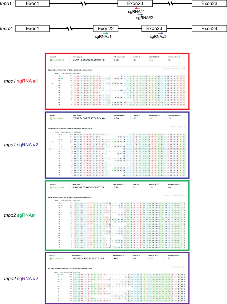 Figure 6—figure supplement 2. X. tropicalis tnpo1 and tnpo2 gene depletion by CRISPR/Cas9.Schematic diagram of tnpo1 and tnpo2 sgRNA target sites (top). Inference of CRISPR Edits (ICE) analysis of indel mutations at predicted target sites (bottom). |