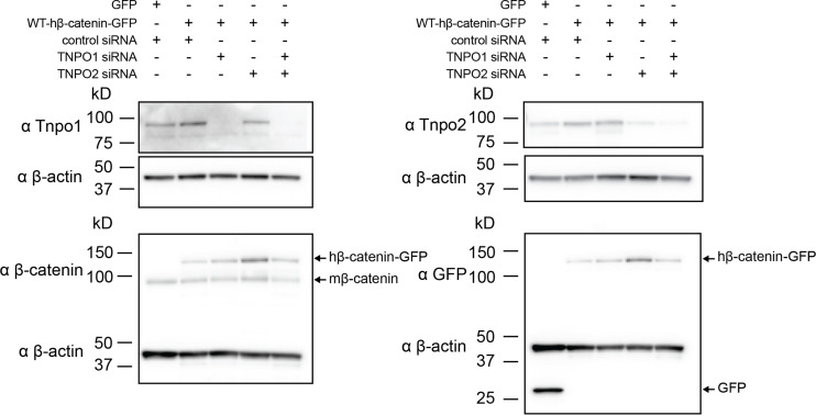 Figure 6—figure supplement 3. Western blots of Tnpo1/2 and β-catenin from 3T3 TCF/LEF luciferase assays.Western blot demonstrating the efficacy of siRNA mediated Tnpo1 and Tnpo2 depletion in mouse embryonic fibroblast Wnt reporter cell lines. |