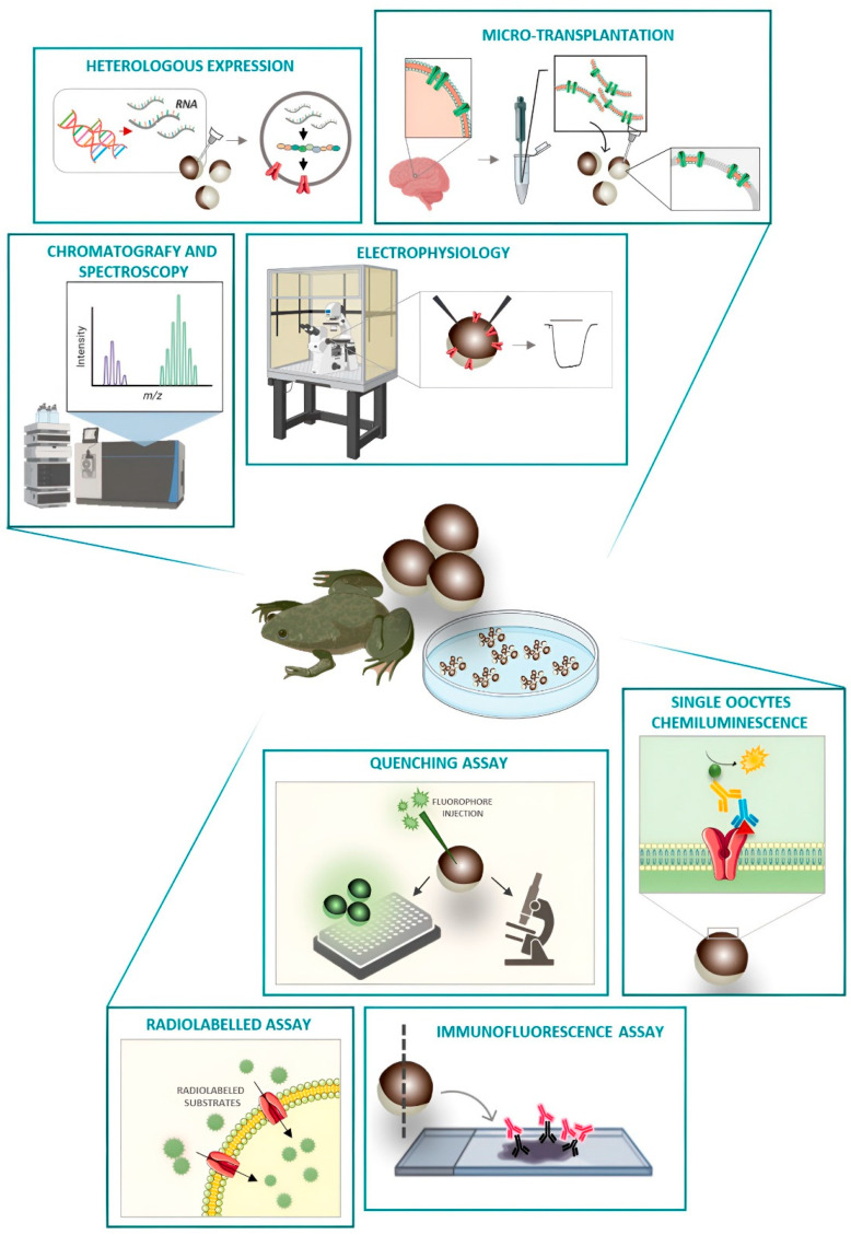 After 50 years, the heterologous expression of proteins in Xenopus laevis oocytes is still essential in many research fields. New approaches and revised protocols, but also classical methods, such as the two-electrode voltage clamp, are applied in studying membrane transporters. New and old methods for investigating the activity and the expression of Solute Carriers (SLC) are reviewed, and the kinds of experiment that are still useful to perform with this kind of cell are reported. Xenopus laevis oocytes at the full-grown stage have a highly efficient biosynthetic apparatus that correctly targets functional proteins at the defined compartment. This small protein factory can produce, fold, and localize almost any kind of wild-type or recombinant protein; some tricks are required to obtain high expression and to verify the functionality. The methodologies examined here are mainly related to research in the field of membrane transporters. This work is certainly not exhaustive; it has been carried out to be helpful to researchers who want to quickly find suggestions and detailed indications when investigating the functionality and expression of the different members of the solute carrier families.