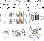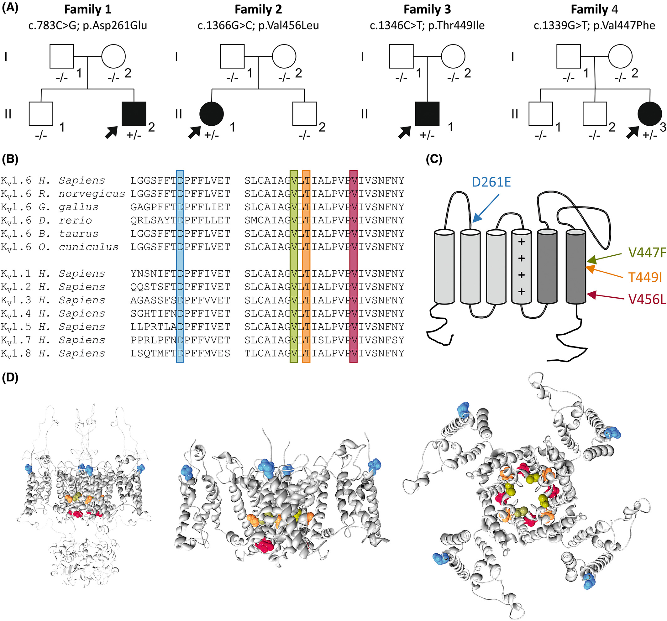 KCNA6 intragenic de novo variants identified in this study. (A) Family trees on individuals carrying de novo KCNA6 variants. (B) Multiple alignment showing complete conservation across species and KV1 homologues of the residues affected by the variants identified in this study (highlighted). (C) Cartoon topology of the human KV1.6 channel indicating the positions of the variants identified in this study. (+) signs indicate positively charged arginine residues in the S4 transmembrane helix. (D) Homology modeling of KV1.6 channel showing the full-length channel in membrane plane (left panel), only the transmembrane domain in membrane plane (middle panel), and from above the membrane plane (right panel). The affected residues are shown in spheres and colored as indicated in C. |