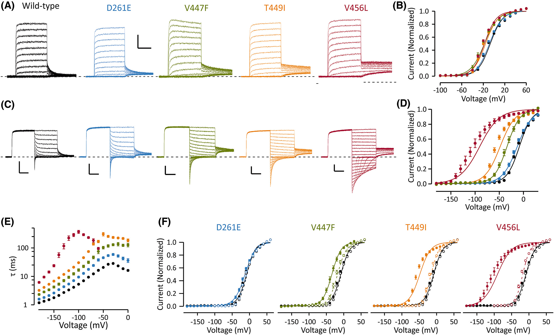 FIGURE 2. Activation and deactivation properties of wild‐type and mutant KV1.6 channels. Data for wild‐type channels are shown in black, for D261E channels in blue, V447F channels in green, T449I in orange, and V456L in red. Data are shown as mean ± SEM. Number of cells is shown in Table 2. (A) Representative traces depicting activation of wild‐type and mutant channels. Voltage protocol consists of 250 ms test voltage steps in 10 mV increments from holding voltage of −80 mV and a tail voltage step to −30 mV. The scale bars are 100 ms (X) and 2 μA (Y). (B) Voltage dependence of activation was assessed using data from recordings by plotting the current at the beginning of the tail voltage step against the test voltage. (C) Representative traces depicting deactivation of wild‐type and mutant channels. Voltage protocol consists of 250 ms depolarizing pre‐pulse to +30 mV from holding voltage of −80 mV, 250 ms test voltage steps in 10 mV decrements, and a tail voltage step to −30 mV. Scale bars are as in a. (D) Voltage dependence of deactivation was assessed using data from recordings by plotting the current at the beginning of the tail voltage step against the test voltage. (E) Time constant of deactivation is plotted against the test voltage. (F) Voltage dependence of activation (open symbols, data from B) and deactivation (closed symbols, data from D) are plotted for each mutant channel. Note that although for wild‐type and D261E the curves overlap, for other mutant channels the voltage dependence of activation and deactivation is clearly distinct. Solid and dashed lines in B, D, and F show fit of Boltzmann equation to mean data; the dashed lines in F show the fit for activation data and solid lines for deactivation data. Data from individual cells were normalized to the peak amplitude derived from fitting Boltzmann equation to data. |