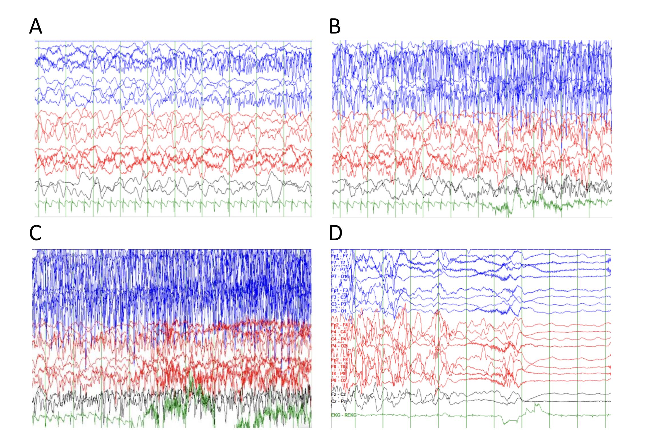 cortex (B); 20 seconds later the seizure involves both hemispheres (C) and ends with a diffuse