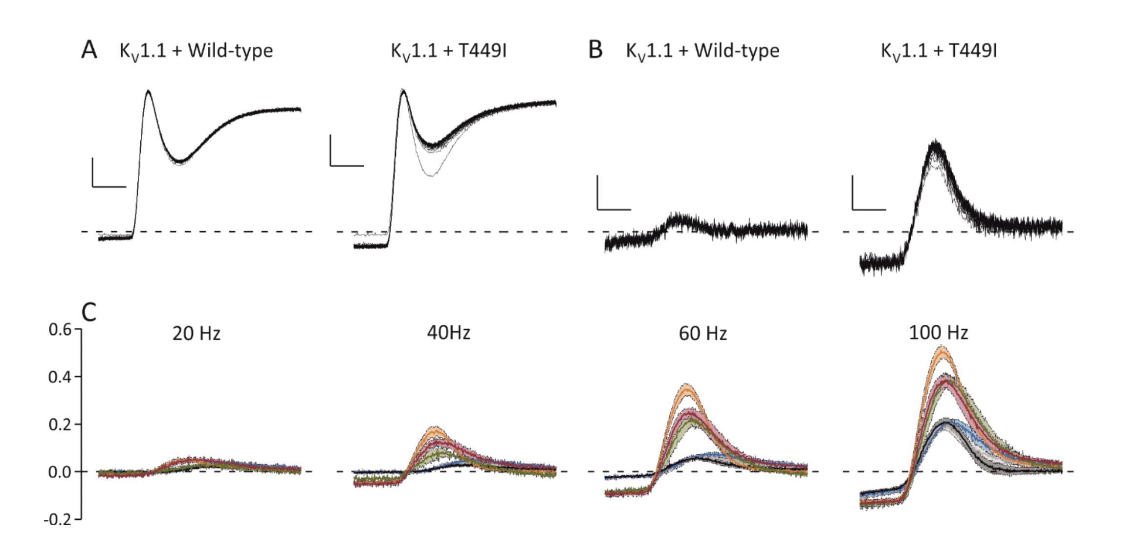 trace is subtracted from the following pulses. Note large increase in KV1.1+T449I currents before and