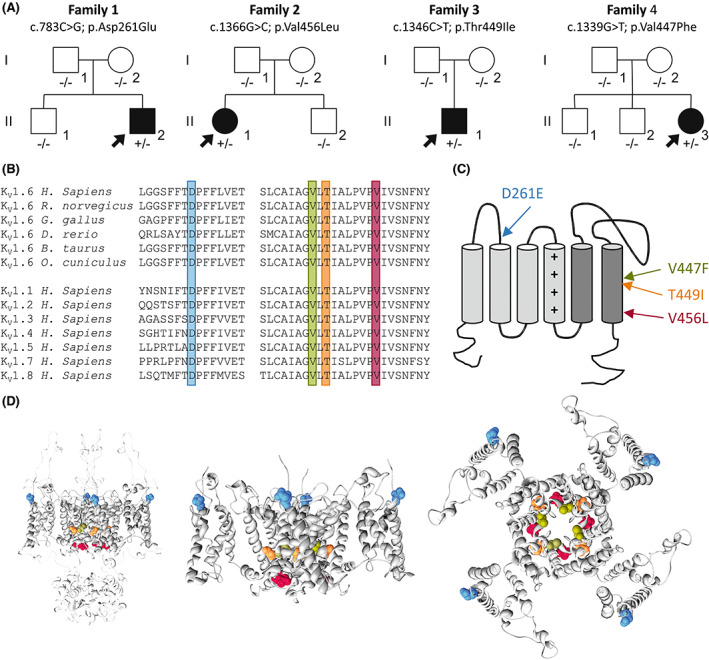 KCNA6 intragenic de novo variants identified in this study. (A) Family trees on individuals carrying de novo KCNA6 variants. (B) Multiple alignment showing complete conservation across species and KV1 homologues of the residues affected by the variants identified in this study (highlighted). (C) Cartoon topology of the human KV1.6 channel indicating the positions of the variants identified in this study. (+) signs indicate positively charged arginine residues in the S4 transmembrane helix. (D) Homology modeling of KV1.6 channel showing the full‐length channel in membrane plane (left panel), only the transmembrane domain in membrane plane (middle panel), and from above the membrane plane (right panel). The affected residues are shown in spheres and colored as indicated in C. |