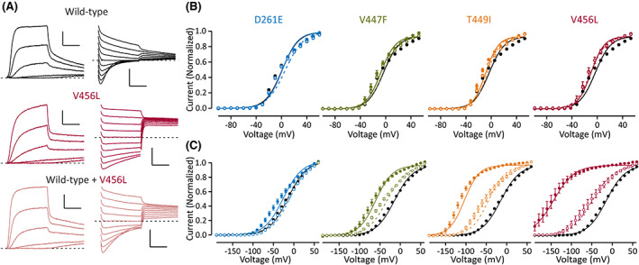 FIGURE 3. Voltage dependence of activation and deactivation of simulated heterozygous mutant KV1.6 channels. Data for wild‐type channels are shown in black, for D261E channels in blue, V447F channels in green, for T449I in orange, and for V456L in red. Data are shown as mean ± SEM. Number of cells is shown in Table 2. Voltage protocols are as in Figure 2A,C, except the duration test pulse and pre‐pulse is 20 ms and the pre‐pulse voltage is +60 mV. (A) Representative traces of oocytes injected with wild‐type (top, black), V456L (middle, red), mRNA alone or both mRNAs together (pink, bottom). Left panel shows current activation in response to test pulses ranging from −40 to 0 mV from holding voltage of −80 mV. Right panel shows current deactivation in response to test pulses ranging from −20 to −110 mV from pre‐pulse voltage of +60 mV. (B) Voltage dependence of activation assessed as in Figure 2A, but the test pulses were only 20 ms in duration. Data are shown for each variant in homomeric (solid symbols and lines) and simulated heterozygous (open symbols, dashed lines) condition. Data for wild‐type channels are shown in black in each graph. (C) Voltage dependence of deactivation assessed as in Figure 2C, but the pre‐ and test pulses were only 20 ms in duration. Symbols and lines are as in B. |