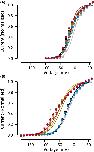 Voltage dependence of activation and deactivation of simulated heterozygous mutant KV1.6 channels. Data for wild-type channels are shown in black, for D261E channels in blue, V447F channels in green, for T449I in orange, and for V456L in red. Data are shown as mean ± SEM. Number of cells is shown in Table 2. Voltage protocols are as in Figure 2A,C, except the duration test pulse and pre-pulse is 20 ms and the pre-pulse voltage is +60 mV. (A) Representative traces of oocytes injected with wild-type (top, black), V456L (middle, red), mRNA alone or both mRNAs together (pink, bottom). Left panel shows current activation in response to test pulses ranging from −40 to 0 mV from holding voltage of −80 mV. Right panel shows current deactivation in response to test pulses ranging from −20 to −110 mV from pre-pulse voltage of +60 mV. (B) Voltage dependence of activation assessed as in Figure 2A, but the test pulses were only 20 ms in duration. Data are shown for each variant in homomeric (solid symbols and lines) and simulated heterozygous (open symbols, dashed lines) condition. Data for wild-type channels are shown in black in each graph. (C) Voltage dependence of deactivation assessed as in Figure 2C, but the pre- and test pulses were only 20 ms in duration. Symbols and lines are as in B. |