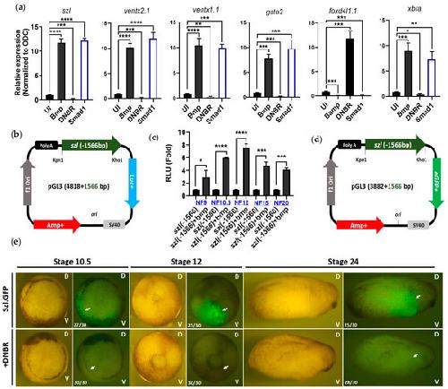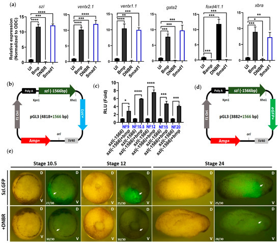 Figure 1. Bmp4 signaling modulates the isolated promoter activity of szl(-1566bp) in a stage-dependent manner: (a) Xenopus leavis embryos were injected with bmp4, dominant negative Bmp4 receptor (dnbr) and smad1 mRNAs (1 ng/embryo) at the one-cell stage and animal caps (10 AC/sample) were dissected at stage 8 and grown up to stage 11. Ventral marker genes, including szl mRNA expression, were assayed through quantitative RT-PCR analysis. (UI: uninjected.) The qPCR values were normalized to ODC. (b) The Szl(-1566) promoter was cloned into pGL3-luc+ vector. (c) Analysis of szl expression at various developmental stages in the presence of Bmp4, the reporter gene activity of the szl(-1566) promoter construct injected with bmp4 mRNA was assayed. Five sets of three, three embryos were used for each sample in each developmental stage. (a,c) Unpaired two-tailed Student’s t-test or ANOVA were applied for statistical analysis. p ≤ 0.05 for *, p ≤ 0.01 for **, p ≤ 0.001 for ***, p ≤ 0.0001 for ****, ns (non-significant) were the assignments for significance. (d) Szl(-1566) promoter was cloned into the pGL3-eGFP+ vector (luc was replaced with eGFP). (e) Embryos (30 embryos/sample) were injected with the reporter construct of szl(-1566)-eGFP+ with or without dnbr mRNA and their eGFP fluorescence was observed at stages 10.5, 12 and 24. (D: dorsal, V: ventral.). The arrows indicate the regions of eGFP fluorescence appeared with szl(-1566)-eGFP+ without dnbr mRNA and decreased with dnbr mRNA.