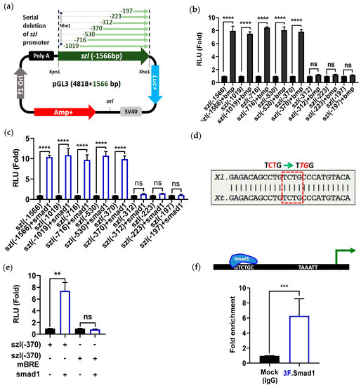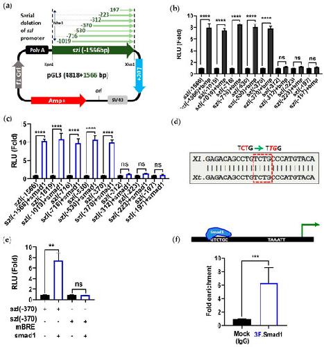 Figure 2. Bmp4 signaling upregulates szl reporter gene activity via Smad1 regulatory response elements within the szl promoter: (a) Schematic diagram of serially deleted constructs of szl promoter. (b) Reporter gene activities of the serially deleted constructs of szl promoter injected with or without bmp4 and (c) smad1 mRNAs. (d) Conserved region of szl promoter consisting of a Bmp4 response element (BRE) (outlined within the dashed red box). (e) Luciferase reporter gene activity of szl(-370) wild type and mutated BRE constructs injected with or without smad1 mRNA were examined. (b,c,e) p ≤ 0.01 for **, p ≤ 0.001 for ***, p ≤ 0.0001 for ****, ns (non-significant) were the assignments for significance. (f) Embryos were injected with 3flag-smad1 mRNA and quantitative ChIP-PCR was performed with anti-Flag immunoprecipitated genomic DNA using specific primers for the szl promoter fragment having the Smad1 binding site. Fold enrichment method used to normalize ChIP-qPCR. Smad1 binding scheme is given in the upper part of figure. (SRE: Smad1 response elements).